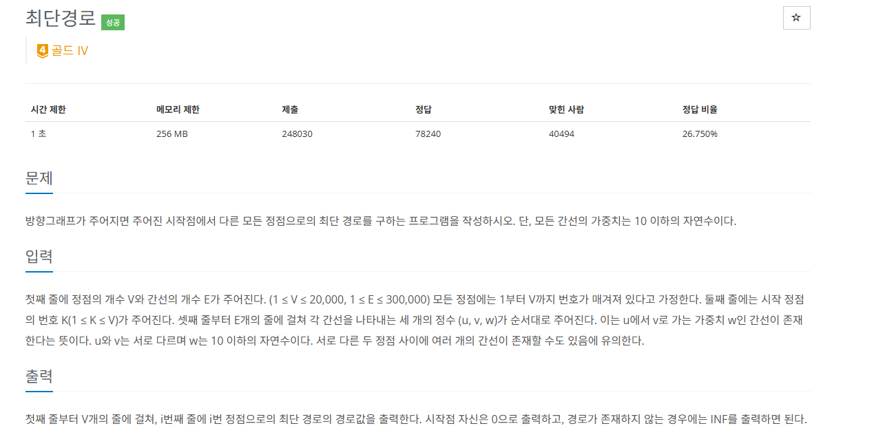 정석적인 다익스트라를 이용하는 문제인데, input으로 주어지는 정점과 간선의 개수가 심상치 않았다.