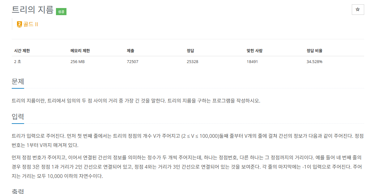 1967번 트리의 지름 문제랑 동일한 개념을 다루는 문제로, 다익스트라 및 DFS를 이용해 푸는 문제이다.